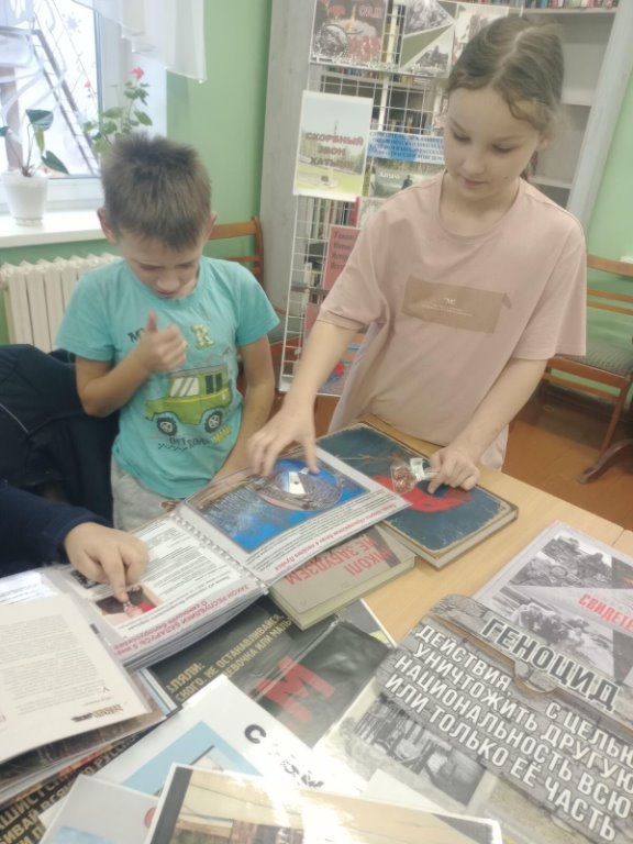 К Международному дню памяти жертв геноцида и предупреждения этого преступления в Елковской сельской библиотеке с детьми прошел урок истории “Геноцид: вспомнить всё, помнить каждого”. Библиотекарь напомнила ребятам о событиях войны, о фактах массового уничтожения мирного населения фашистами, о лагерях смерти, о том, как ни в чем неповинные люди стали жертвами преступлений нацистов. К мероприятию была подготовлена подборка литературы по теме. Знакомство с такой литературой помогает раскрыть молодому поколению подлинность событий военного времени и способствует сохранению исторической правды.